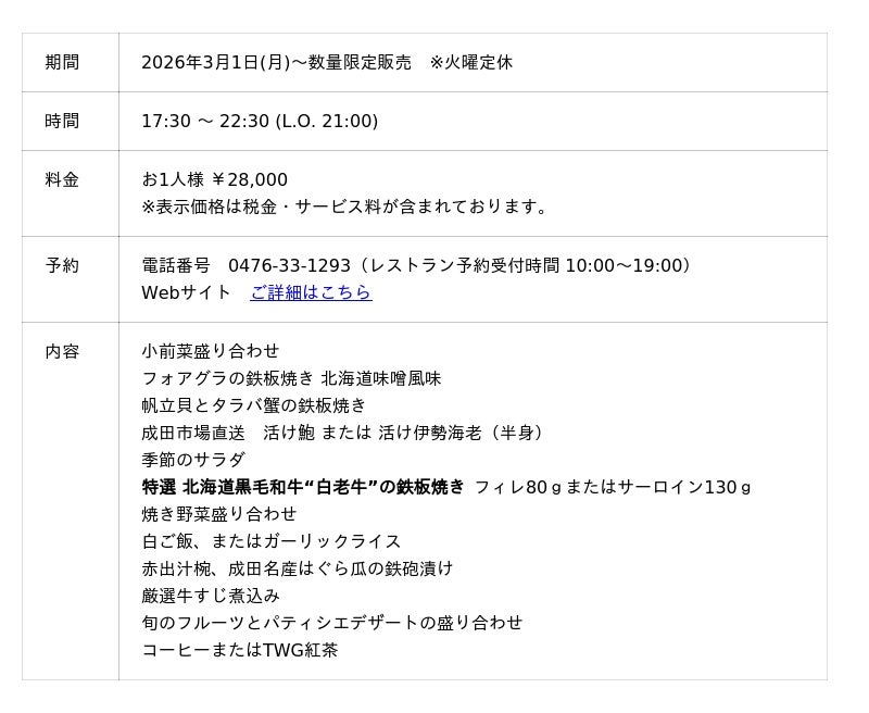 ANAクラウンプラザホテル成田(成田市堀之内 総支配人 ダヴィデ・ザナルディ)では、3月1日(日)から北海道三大和牛「白老牛」を使った特別な四季彩コースを17F 鉄板焼「菜里多」にて数量限定で販売開始いたしました。