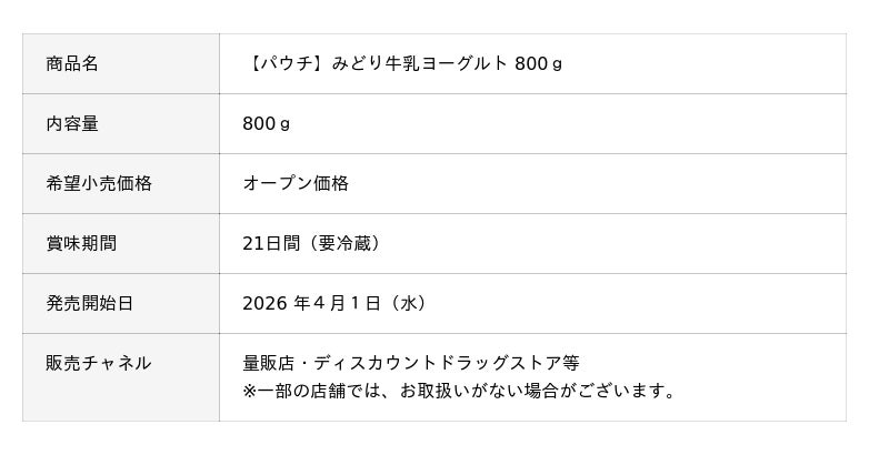 新発売の「【パウチ】みどり牛乳ヨーグルト 800g」は、生乳 100%を使用した、素材本来の風味を生かした贅沢な仕立てが特長です。