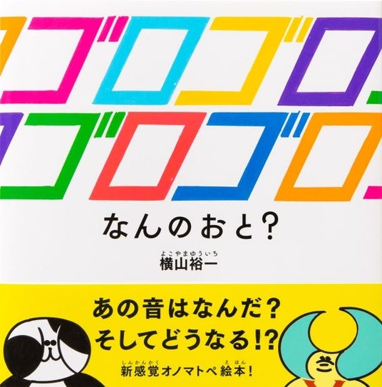 日本のビジュアルアーティスト/漫画家である横山裕一は、「ネオ漫画」と呼ばれる実験的な表現や、時間の流れを独自の方法で描き出す作風により、オルタナティブ・コミックスの分野で広く知られています。『ゴロゴロゴロゴロ なんのおと?』では、横山の創作における重要なテーマのひとつである「音」を題材に、子どもたちとともにその世界を探求しています。タイポグラフィとリズムを遊び心たっぷりに用いながら、さまざまな音とその振動をグラフィカルに表現しています。本作は、オノマトペが持つ視覚的な力を通して、ドローイングが生み出すリズム感へと迫る、きわめて独創的な試みとなっています。