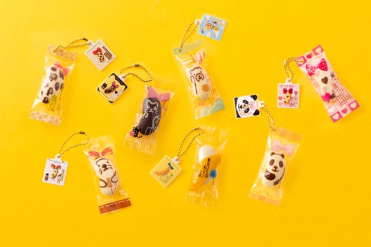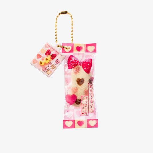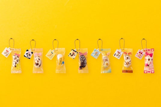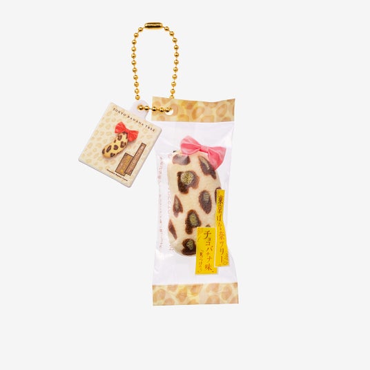 『東京ばな奈』の個包装を再現し、8個入のパッケージデザインのプレートを合わせてボールチェーン付きのチャームにしたカプセルトイ専用アイテムが誕生しました。『東京ばな奈』のふわふわの手触りにもこだわって、スクイーズにすることで再現。その本物そっくりな見た目や感触に驚くこと間違いありません。