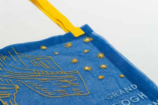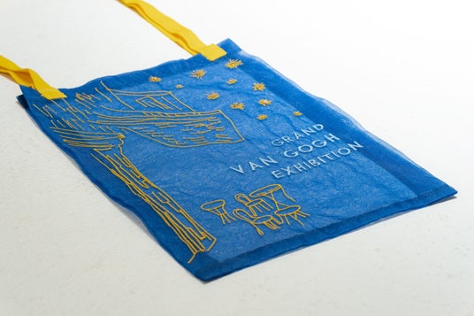 ファン・ゴッホ《夜のカフェテラス》をイメージして、オーガンジー素材で澄んだ夜空を、黄色い糸の刺繍で温かい光が漏れるカフェテラスを再現しました。きらめく夜空の星はスパンコールで表現した、東京展限定グッズです。本スペシャルチケットには黄色い持ち手の限定色バッグが付属します。