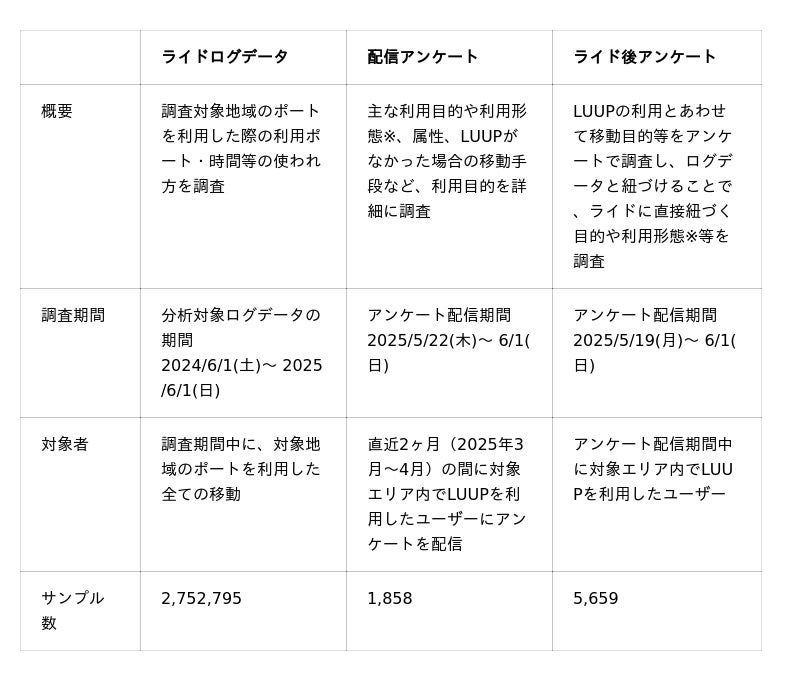 株式会社Luup(本社:東京都品川区、代表取締役CEO:岡井大輝、以下「Luup」)は、パシフィックコンサルタンツ株式会社(住所:東京都千代田区、代表取締役社長執行役員:大本修)と共同で、都市部における電動マイクロモビリティの利用実態分析および社会的意義の整理に係る調査を実施しました。