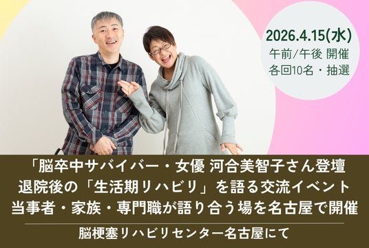 ヘルスケア事業を展開するメディロムグループの株式会社MEDIROM Rehab Solutions(本社:東京都港区、代表取締役社長:伊藤康祐)が運営する自費リハビリ施設『脳梗塞リハビリセンター』は、2026年4月15日(水)、脳卒中サバイバーで女優の河合美智子さんと、夫で俳優の峯村純一さんを迎え、脳卒中後遺症やリハビリとの向き合い方について当事者・家族・支援者が語り合う交流イベント「リハセンツアーin名古屋」を開催いたします。