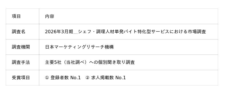 株式会社シェアダイン(本社:東京都港区、代表取締役:飯田陽狩、以下「シェアダイン」)が運営する、料理人と飲食事業者をつなぐ人材・キャリア支援プラットフォーム「CHEFLINK(シェフリンク)」は、日本マーケティングリサーチ機構が実施した市場調査において、「シェフ・調理人材単発バイト特化型サービス」部門で登録者数No.1・求人掲載数No.1を獲得いたしました。