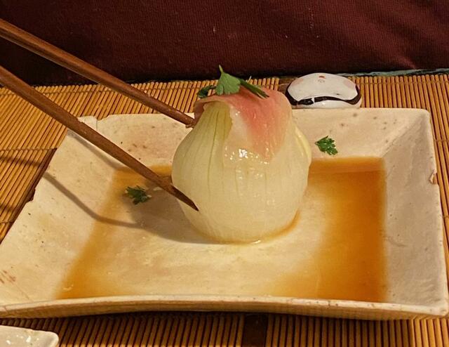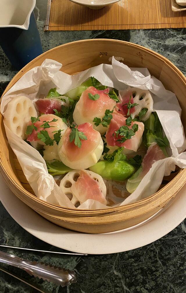 新玉ねぎの蒸籠蒸し(春蕾、レンコンも一緒に蒸した)、生ハム、イタリアンパセリ。ポン酢醤油で食べる。新玉ねぎ、めちゃうまい。
