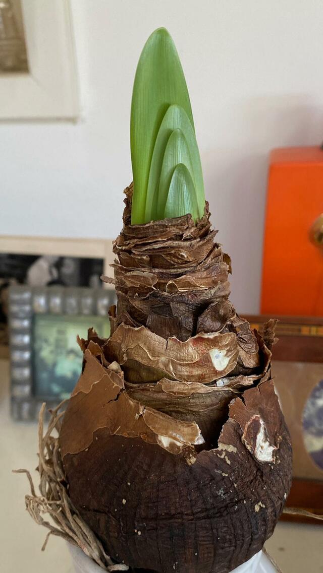 ONちゃんからもらったマジックアマリリスは、先日花が枯れたのに、今朝、4つの芽吹きを発見。
