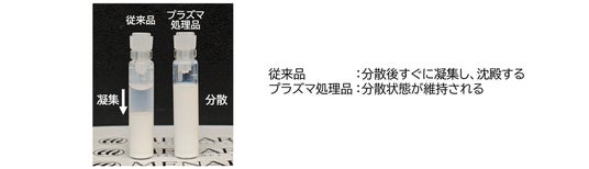 微粒子酸化チタンのような無機粉体は、水中に分散させると直ちに凝集体を形成し、底に沈殿してしまいます(図2 従来品)。一方、微粒子酸化チタンの水分散液に液面プラズマを照射すると、放電の衝撃により凝集体が解砕されるとともに、粒子表面の電気的な性質が変化します。その結果、粒子間の電気的反発力が高まり、再凝集が抑制され、高分散状態を維持することが可能になりました(図2 プラズマ処理品)。