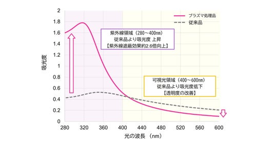 その結果、紫外線領域(280~400nm)ではプラズマ処理品は従来品と比較して吸光度が高く、約2.6倍*の遮蔽効果を有することを確認しました。一方、可視光領域(400~600nm)では、プラズマ処理品は従来品よりも吸光度が低く、微粒子酸化チタンが高分散化されたことで、透明度が高くなったと考えられます(図4、図5)。