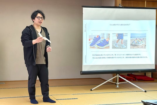 イベント後半では、アメリカ足病医学(APMA)の知見に基づく「足育」をテーマに、子どもの足の発達と靴選びについて実践的に解説しました。
