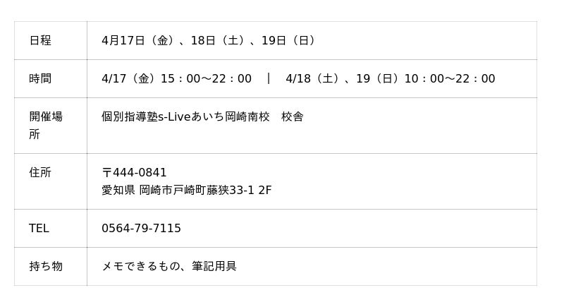 個別指導塾s-Liveあいち岡崎南校 入塾説明会の詳細