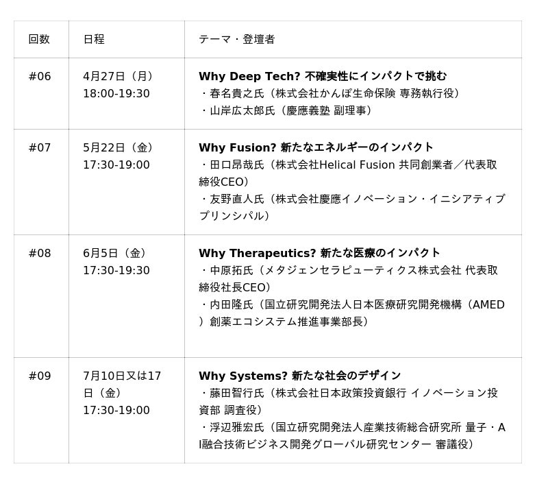 - 主催:慶應義塾大学 イノベーション推進本部- 期間:2026年4月27日(月)~7月 *最終回日程は調整中