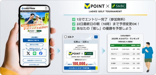 今回、2026年3月20日(金)から22日(日)まで千葉県の紫カントリークラブ すみれコースで開催される女子プロゴルフツアー「Vポイント×SMBC レディスゴルフトーナメント」の優勝選手を予想するキャンペーン(https://questpark.tsite.jp/golf-vpl/)を、2026年3月17日(火)より実施いたします。参加者は、日本女子プロゴルフ協会のサイト(https://www.lpga.or.jp/tournament/jlpgatour/2026/2100/info)で公開される公式リーダーズボードを見ながら大会の展開を追うことができ、予想の締め切りまでは何度でも予想を変更することが可能です。ゴルフファンの方はもちろん、ゴルフに詳しくない方でも大会をお楽しみいただける企画となっておりますので、ぜひご参加ください。