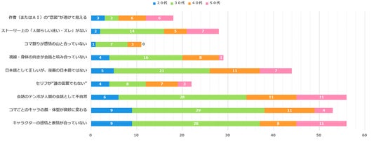 前述の質問で、AI生成マンガに「違和感がある」と答えた人に理由を尋ねたところ、「会話のテンポが人間の会話として不自然」と「キャラクターの感情と表情が合っていない」の二つの回答が共に56票と最も多い結果となりました。