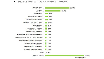 MMDLaboが運営するMMD研究所が18歳~69歳の男女2085名を対象に実施した「シェアリングエコノミーサービスに関する調査」によると、世代による、身近なオンラインサービスの変遷が鮮明になっている。 複数回答可で聞いた、利用したことのあるシェアリングエコノミーサービスの1位は「オークションサービス」(32.9%)、2位は「フリマサービス」(20.9%)、3位は大分離れて「カーシェアサービス」(4.0%)だった。一方、「利用したことはない」も52.9%にのぼり、実際の利用率はまだ低く、普及の途上だといえる。
