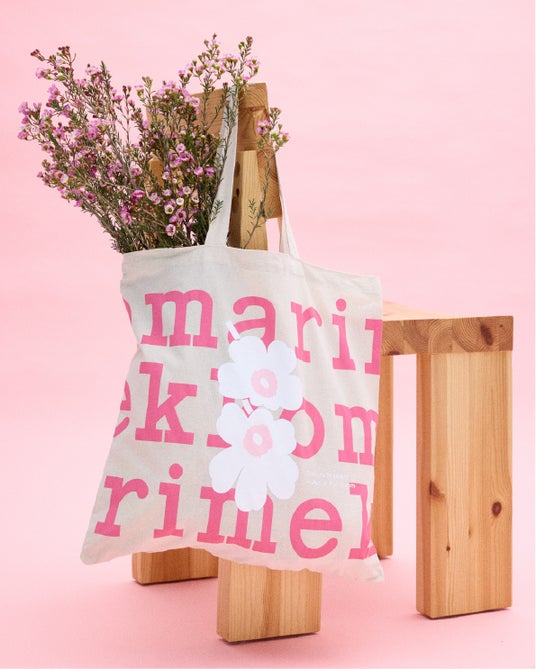 商品を税込27,500円以上お買い上げの方に、この季節だけの限定デザインファブリックバッグをプレゼント。鮮やかなピンクのマリメッコロゴに、桜からインスパイアされた優しい白とピンクのウニッコがさりげなくデザインされています。