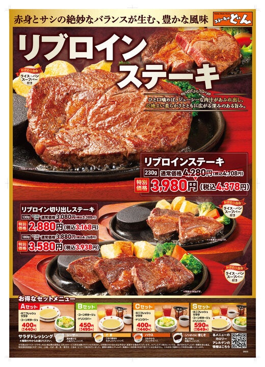 リニューアルオープンを記念し、2026年4月30日(木)までの期間限定で、ステーキのどん自慢の柔らかさとジューシーさにこだわった「リブロインステーキ」をリニューアル感謝価格でご提供いたします。