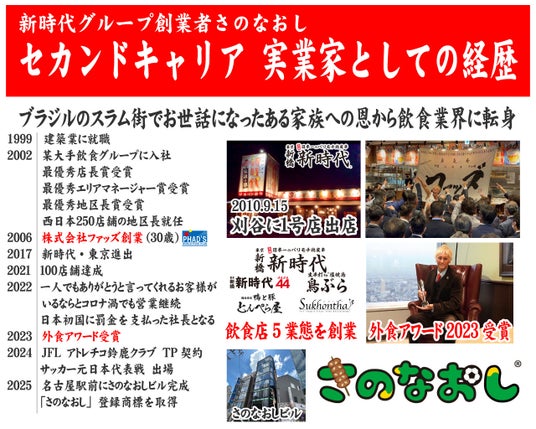 さのなおし 1975年9月4日(串の日)生まれ、8歳の時にサッカーをはじめ、岐阜県立岐阜工業高等学校ではインターハイ、全国高校サッカー選手権に出場。卒業後、サッカー王国ブラジルへ。5年間プロサッカー選手としてブラジルサンパウロ州で活躍。25歳で怪我のため引退後、父親が経営する建築会社に身を投じる。しかし、ブラジルのスラム街でお世話になったある家族への恩から飲食業界に転身。2006年株式会社ファッズを創業。2010年新時代1号店をオープン。2023年外食アワードを受賞。現在は、今期着地でグループ年商280億円、従業員数6000名、200店を展開する。