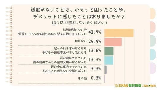 「送迎がないことで、かえって困ったことや、デメリットに感じたことはありましたか?」と質問したところ、最も多い回答は「移動時間がない分、学習モードへの気持ちの切り替えが難しそうだった(43.7%)」で、全体の4割を超えています。