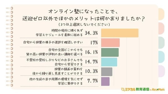 「オンライン塾になったことで、送迎ゼロ以外でほかのメリットは何かありましたか?」と質問したところ、回答は「時間や場所に縛られず、学習スケジュールを柔軟に組める(34.3%)」が最も多く、全体の3割を占める結果でした。