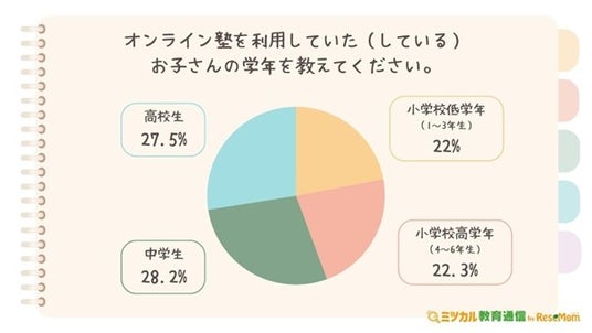 次に、「オンライン塾を利用していた(している)お子さんの学年を教えてください。」と質問したところ、最も多い回答は「中学生(28.2%)」でした。次いで、ほぼ同率で「高校生(27.5%)」です。