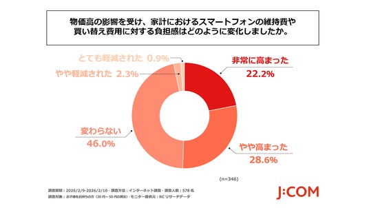 また、「物価高の影響を受け、家計におけるスマートフォンの維持費や買い替え費用に対する負担感はどのように変化したか」を尋ねる設問への回答では、1位が「変わらない」で46.0%、2位が「やや高まった」で28.6%、3位が「非常に高まった」で22.2%という結果になりました。この結果から、お子さまにスマートフォンを持たせていると回答した方の半数以上が、物価高の影響を受け、家計におけるスマートフォンの維持費や買い替え費用に対する負担感が、程度の差はあるものの、「高まった」と感じていることが判明しました。