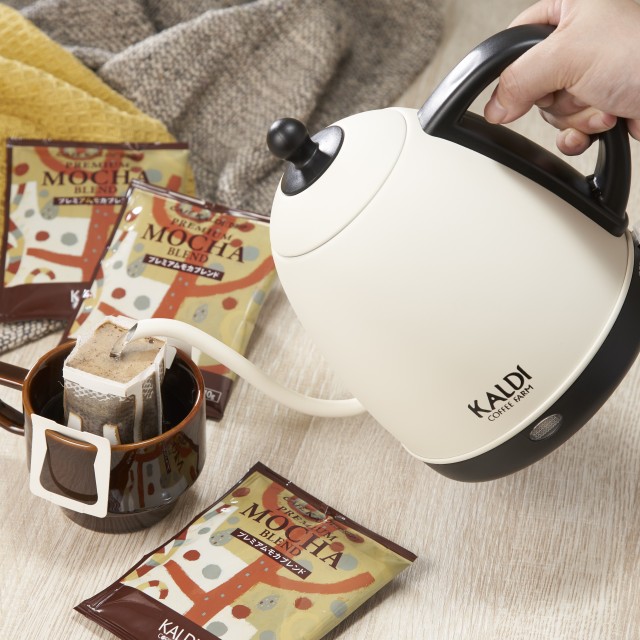 さらに、細い注ぎ口で注ぐ湯量が調整しやすく、好みの濃さでコーヒーを抽出できる「電気コーヒーポット」と、イエメン産モカマタリとエチオピア産モカの2種類のモカを使用した「プレミアムモカブレンド」のドリップコーヒーがセットになった「電気コーヒーポット&オリジナル ドリップコーヒーセット」も登場。こちらも見逃せません!