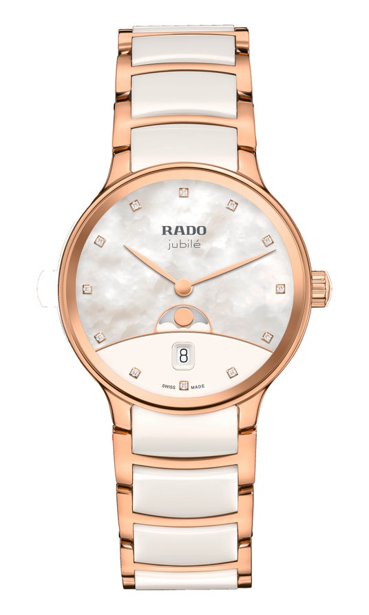 ホワイトマザーオブパール、グレーのRadoおよびJubileのロゴ