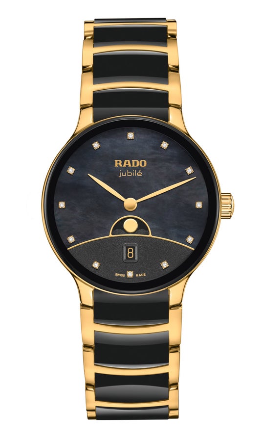 ブラックマザーオブパール、イエローゴールド プリントのRadoおよびJubileのロゴ