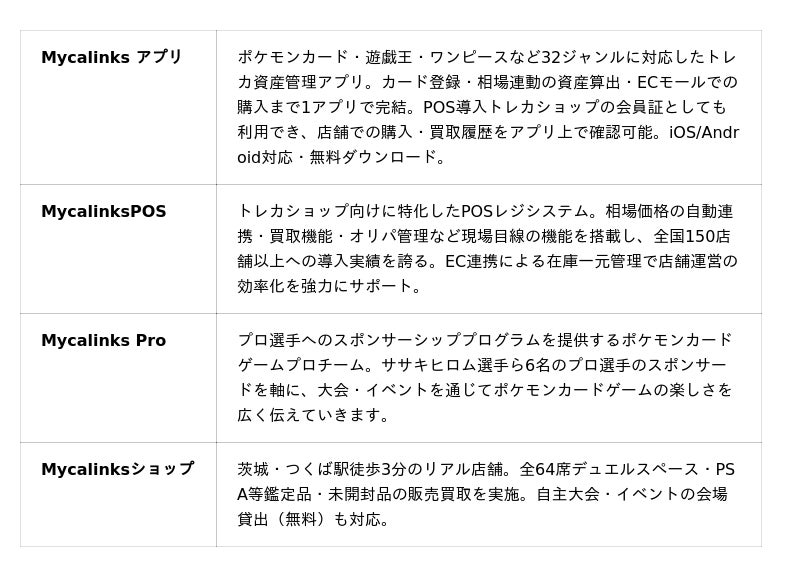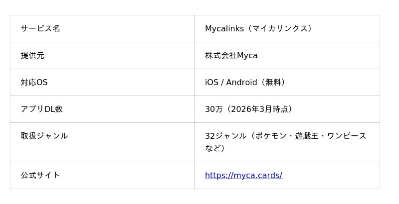 株式会社Myca(所在地:茨城県つくば市、代表取締役 木村 祐介、以下「当社」)が運営するトレーディングカード管理アプリ「Mycalinks(マイカリンクス)」は、Sensor Towerを用いた調査データにもとづき、2023年4月~2026年1月の期間において日本国内トレカ管理アプリでダウンロード数No.1(※)を達成し、累計30万ダウンロードを突破したことをお知らせいたします。当社は引き続き、トレカファンの皆さまにとってより便利で価値あるサービスの提供に努めてまいります。