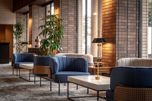 格式ある佇まいを活かしながら、身体が触れる部分の素材の質感を向上、触り心地のよい木材、座り心地の良いラウンジチェア、踏み心地のよいカーペットがゲストを迎えます。既存のレンガタイルや照明、モールディング装飾を活かし、クラシックホテルの風格は残しながら、ビッグテーブルやラウンジチェアを設置し、お客さまをお迎えする空間として、格式に合わせた上質さを表現しました。サインも刷新し、視認性と意匠性を向上しました。
