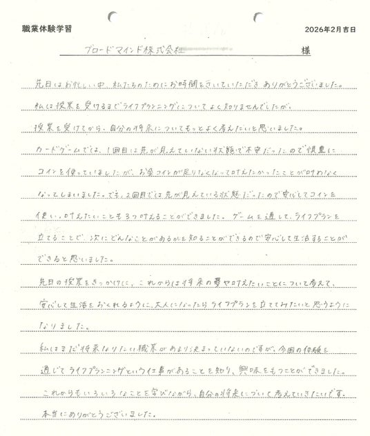「金融の力を解き放つ」をパーパスに掲げ、ライフプラン実現を支援する金融サービスの開発・提供を手掛けるブロードマインド株式会社は、カードゲームを用いた出前授業を2024年9月からこれまで3,000人超の児童生徒へ提供。今回は、2026年1月22日に横浜市立保土ヶ谷中学校の中学2年生25名へ授業を実施しました。