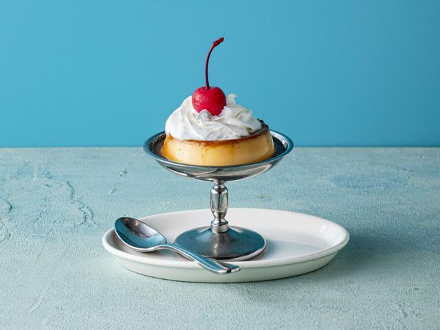 ホイップとチェリーがのった、見た目もかわいいレトロなプリン。しっかりとした固さがありながら、なめらかな口どけにこだわりました。
