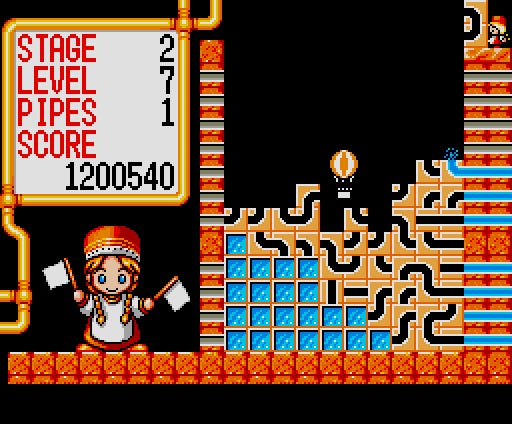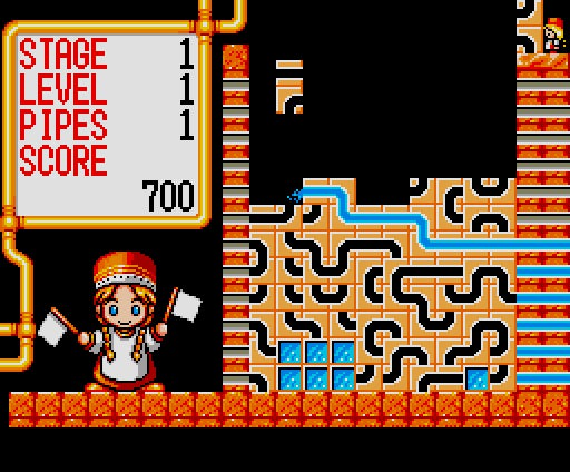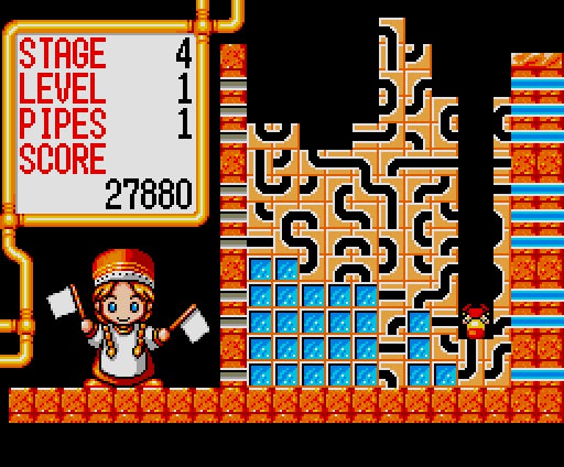本作は1991年にリリースされたアクションパズル。プレイヤ−の目的は、次々と落ちてくるパイプブロックを使って、画面右から左へと水を運ぶパイプラインを作ること。ブロックはふたつひと組で構成されており、回転させることが可能な他、半分が宙に浮いた状態で着地すると、宙に浮いた方は分かれて落下するという、落ちゲーではお馴染みの特性を持っています。