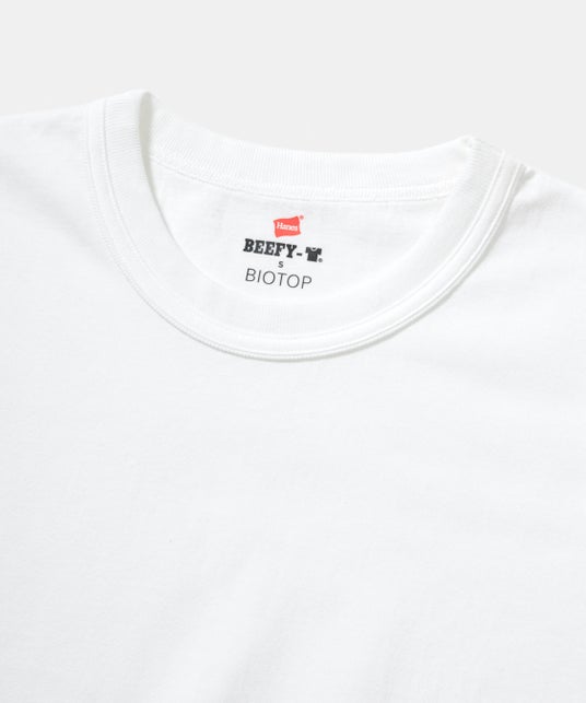 ヘビーウェイトTシャツの代名詞であると同時にHane 屈指のシグネチャーモデルとされる、6.1オンスのBEEFYコットンジャージー (天竺) 生地をセレクト。