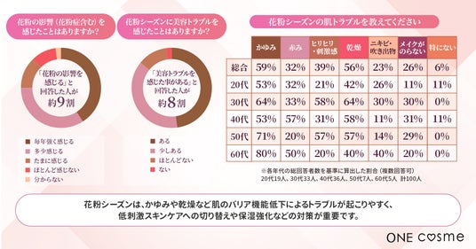 そこで今回、コスメ・スキンケア情報を発信する『ONEcosme』では、20代以上の女性100名を対象に、花粉シーズンに感じる美容トラブルの実態やスキンケア・メイク対策への意識について調査を実施しました。