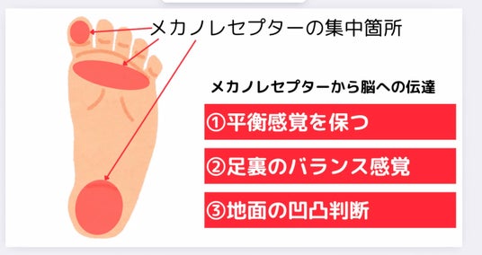 足裏には数多くの感覚受容器である「メカノレセプター」が100以上も存在しており、 歩くことでこの感覚センサーが脳に働きかけ、 平衡感覚・バランス・地面認知の能力を獲得していきます。