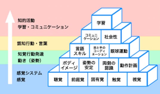 「発達は感覚から積み上がる」という理論を(発達過程)を図式化した感覚統合ピラミッド