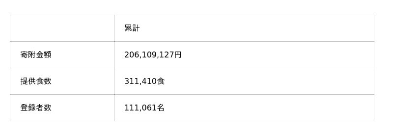 このたび、「こどもごちめし」に寄せられた寄附金の総額が2億円を突破いたしました。これまで活動を支えてくださった企業・個人の皆さまに、心より感謝申し上げます。昨年8月に寄附金1億円を発表して以降、子どもの食をめぐる課題への社会的関心が広がっていることに加え、企業の皆さまと新たな寄附の取り組みを進めてきたことで、「こどもごちめし」の認知と支援の輪がさらに広がってきたことを実感しています。私たちはこれからも、一人でも多くの子どもたちに「食の安心」と笑顔を届けられるよう取り組んでまいります。引き続きのご支援とご協力を賜りますよう、よろしくお願いいたします。