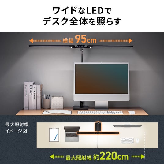 ・幅約95cmのワイド設計で、デスク全体をムラなく明るく照射