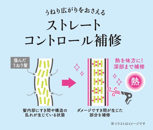 また、既存のダメージリペアシリーズに加え、新たに「ストレート&モイストシリーズ」も登場。傷んだうねり髪をケアし、毛先までうるおいまとまるストレート髪へ導きます。