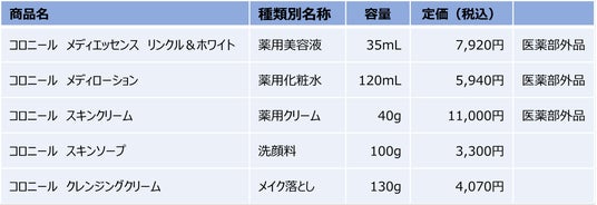 コロニールシリーズのスキンケア商品ラインナップ