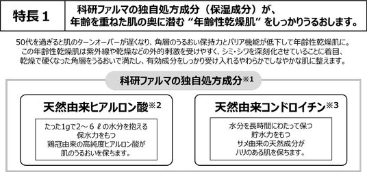 - 科研ファルマの独自処方成分(保湿成分)「天然由来ヒアルロン酸」「天然由来コンドロイチン硫酸」を配合し、「年齢性乾燥肌」をうるおいに満ちた健やかな肌に導きます。