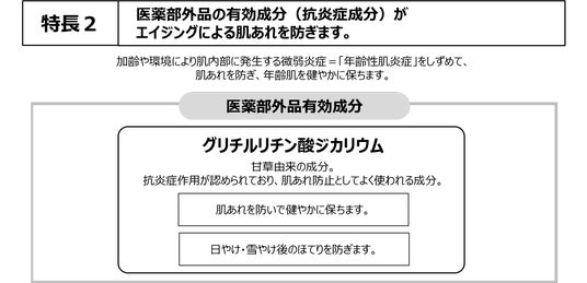 - 医薬部外品の有効成分(抗炎症成分)「グリチルリチン酸ジカリウム」を配合し、加齢や環境により肌内部に発生する微弱炎症=「年齢性肌炎症」を抑えて肌あれを防ぎ、肌エイジングをケア※2します。