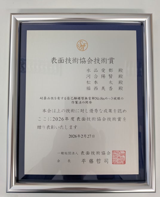 めっき技術のサン工業株式会社(本社:長野県伊那市、代表取締役社長:川上 健夫)は、この度、神奈川大学化学生命学部応用科学科の松本 太教授らのグループと共同開発した「耐薬品性を有する自己触媒型無電解Ni-Snめっき皮膜の作製法の開発」が、表面技術協会より技術賞を受賞しました。本技術は、パンデミックを経て高まり続ける社会全体の衛生意識に応える、次世代の表面処理技術として、多様な産業分野での活用が期待されています。