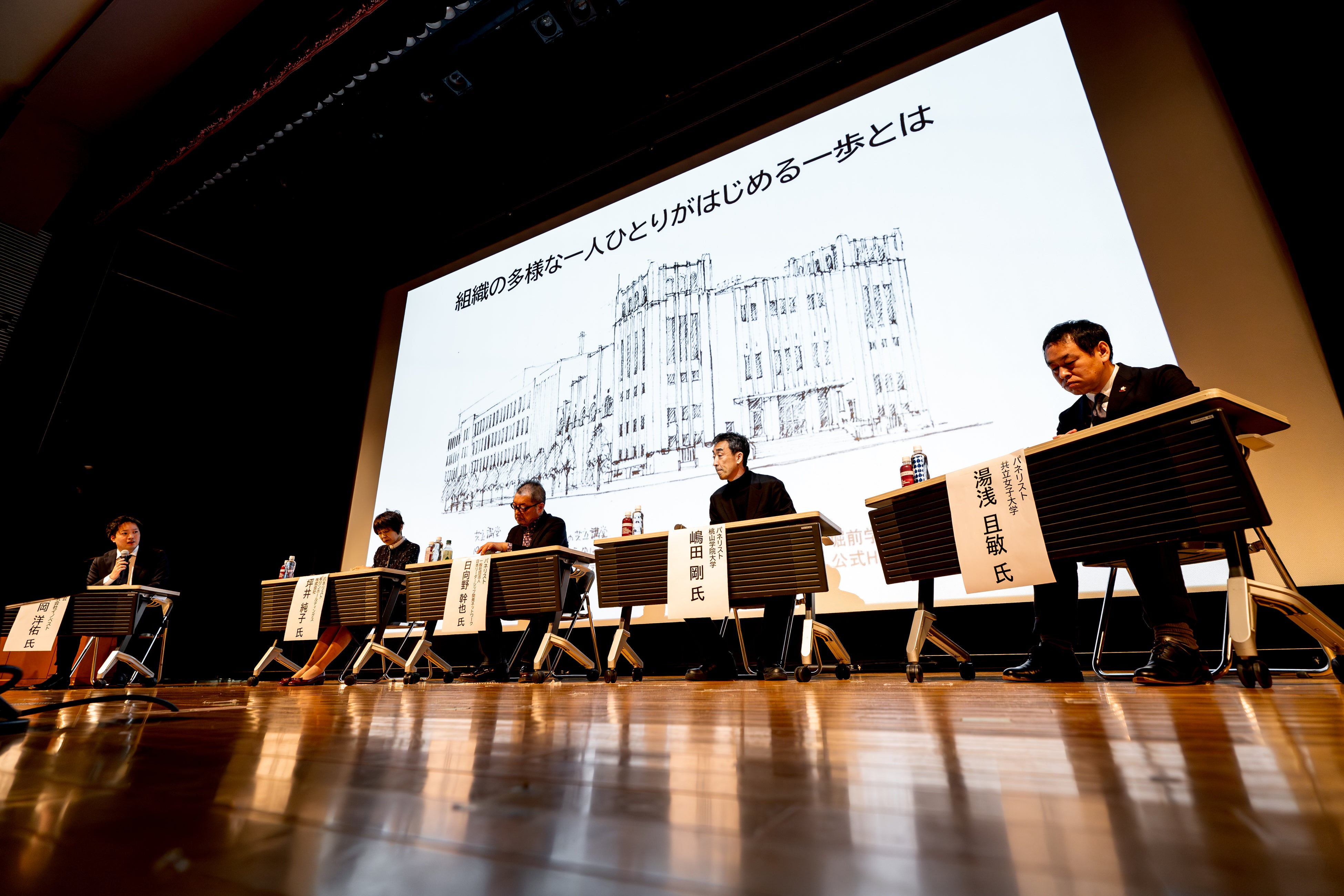 パネルディスカッションは、「組織の多様な一人ひとりがはじめる一歩とは」をテーマに実施しました。登壇者は基調講演を行った坪井氏・日向野氏に加え、桃山学院大学の嶋田剛氏(大学企画担当部長)、本学の湯浅且敏准教授の4名です。企業、専門家、他大学、本学というそれぞれ異なる視点から、「教職員一人ひとりの挑戦が、どのように学生の学びに波及し、組織全体の力へとつながっていくのか」について議論が交わされました。登壇者からは「多様な実践をリーダーシップ教育の観点で言語化すること」や、「失敗を恐れずに楽しむ仕掛けを作ること」の重要性が指摘されました。