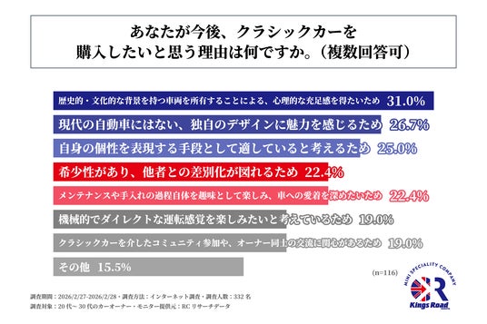 調査の最後、今後クラシックカーを所有する意向がある20代~30代のカーオーナーを対象に「今後、クラシックカーを購入したいと思う理由は何か」を尋ねる設問への回答では、1位が「歴史的・文化的な背景を持つ車両を所有することによる、心理的な充足感を得たいため」で31.0%、2位が「現代の自動車にはない、独自のデザインに魅力を感じるため」で26.7%、3位が「自身の個性を表現する手段として適していると考えるため」で25.0%という結果になりました。この結果から、今後クラシックカーを所有する意向がある20代~30代のカーオーナーが挙げるその主な理由は、「歴史的・文化的な背景を持つ車両を所有することによる、心理的な充足感を得たいため」や「現代の自動車にはない、独自のデザインに魅力を感じるため」であることが明らかになりました。