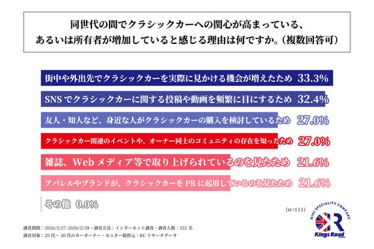 また、同世代の間でクラシックカーへの関心の高まりや所有者の増加を感じている20代~30代のカーオーナーを対象に「同世代の間でクラシックカーへの関心が高まっている、あるいは所有者が増加していると感じる理由は何か」を尋ねる設問への回答では、1位が「街中や外出先でクラシックカーを実際に見かける機会が増えたため」で33.3%、2位が「SNSでクラシックカーに関する投稿や動画を頻繁に目にするため」で32.4%、3位が同率で「友人・知人など、身近な人がクラシックカーの購入を検討しているため」と「クラシックカー関連のイベントや、オーナー同士のコミュニティの存在を知ったため」で27.0%という結果になりました。この結果から、同世代の間でクラシックカーへの関心の高まりや所有者の増加を感じている主な理由は、「街中や外出先でクラシックカーを実際に見かける機会が増えたため」や「SNSでクラシックカーに関する投稿や動画を頻繁に目にするため」であることが判明しました。