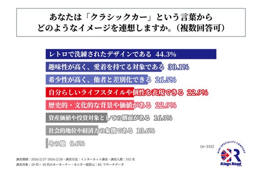 続いて、「『クラシックカー』という言葉からどのようなイメージを連想するか」を尋ねる設問への回答では、1位が「レトロで洗練されたデザインである」で44.3%、2位が「趣味性が高く、愛着を持てる対象である」で30.1%、3位が「希少性が高く、他者と差別化できる」で26.5%という結果になりました。この結果から、20代~30代のカーオーナーが「クラシックカー」という言葉から連想する主なイメージは、「レトロで洗練されたデザイン」や「趣味性が高く、愛着を持てる対象」であることがわかりました。