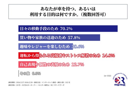 20代~30代のカーオーナーの約7割が、車を持つ、あるいは利用する目的として「日々の移動手段のため」と回答