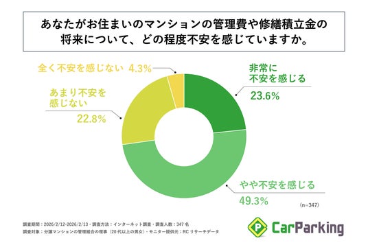 分譲マンション管理組合の理事の7割以上が、自身のマンションの管理費や修繕積立金の将来について不安を感じている